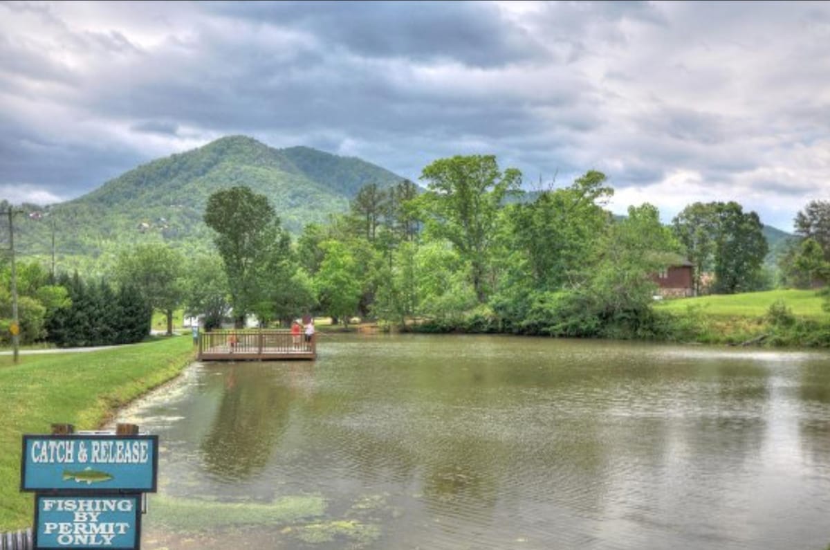 Guests also have access to nearby community amenities including a seasonal pool with a snack bar, a catch-and-release fishing pond, and a gazebo with a 20-foot hearth fireplace.