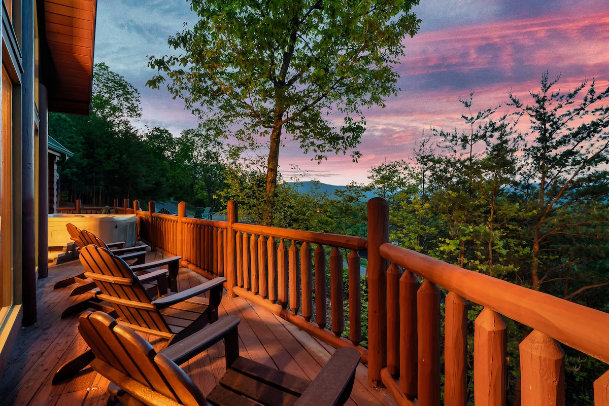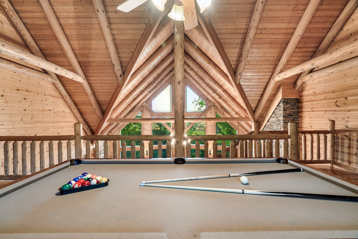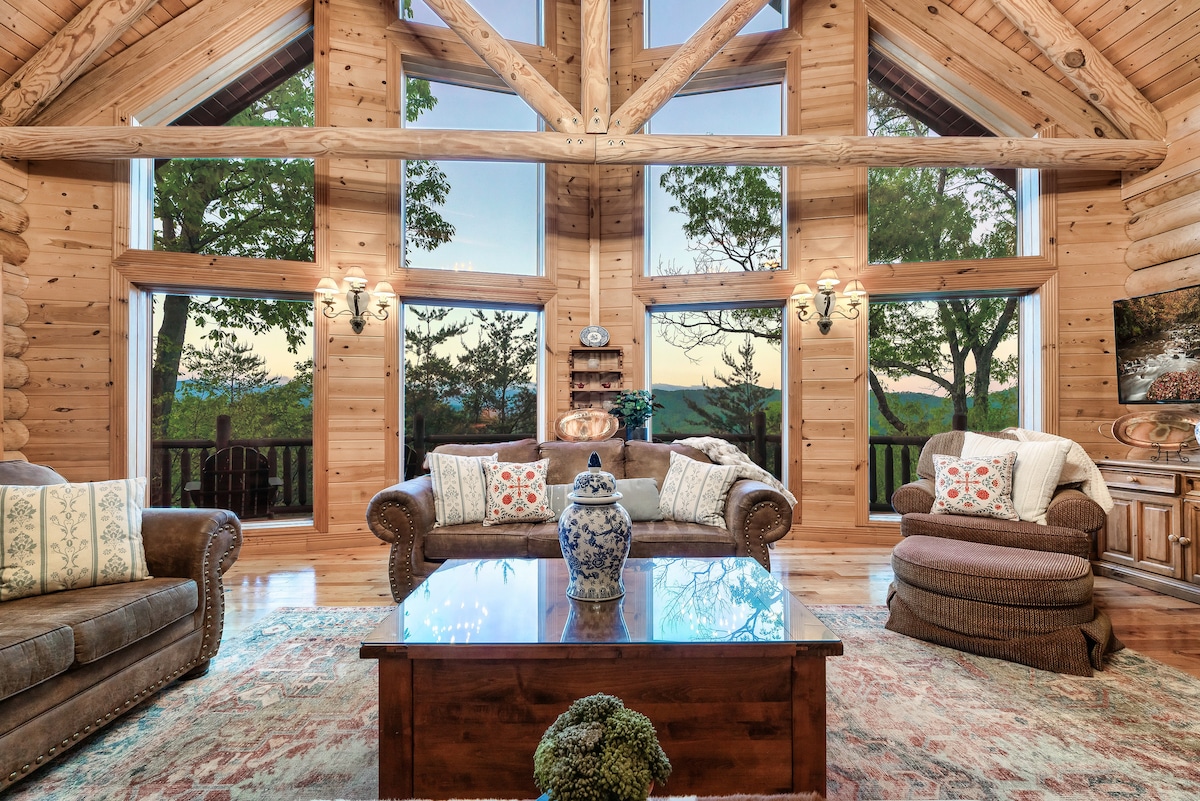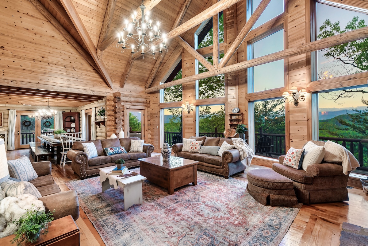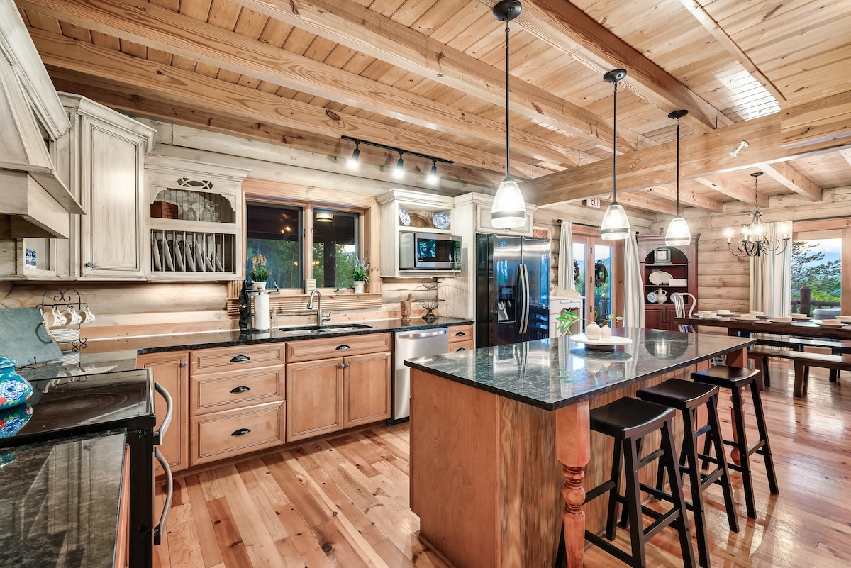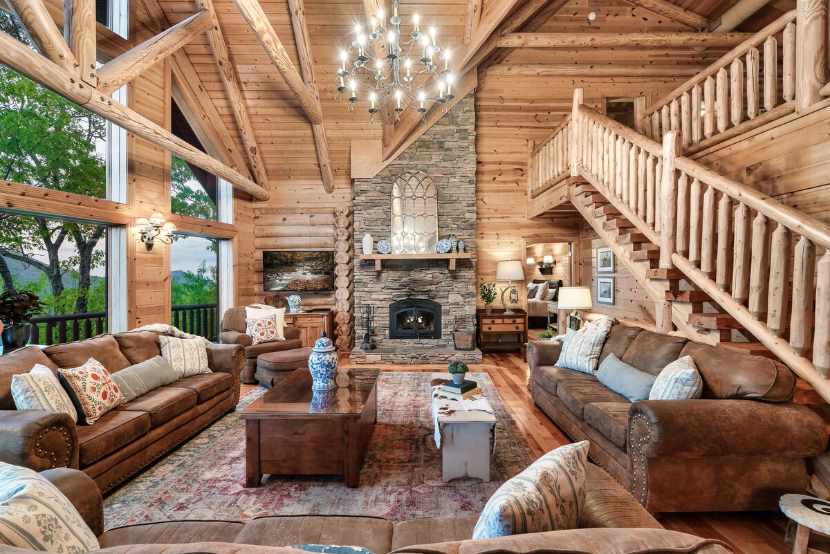 From the handcrafted pine logs to the soaring cathedral ceilings and stone fireplaces, every detail of The Knotty Lodge blends rustic charm with modern luxury. Wake up to panoramic views from 2,100 feet above sea level and enjoy peaceful mornings or relaxing sunsets from the spacious decks.