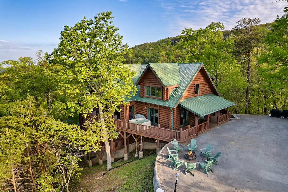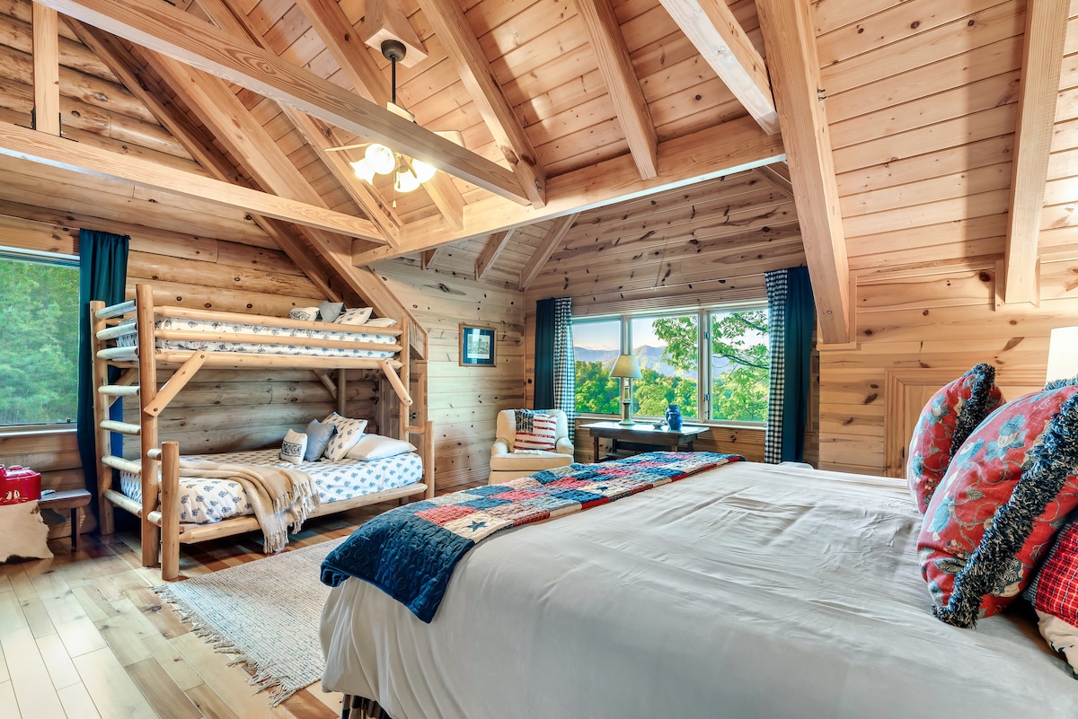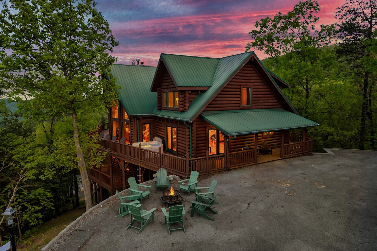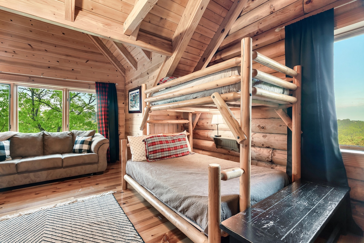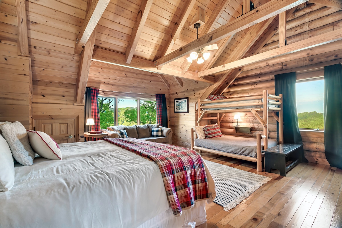From the handcrafted pine logs to the soaring cathedral ceilings and stone fireplaces, every detail of The Knotty Lodge blends rustic charm with modern luxury. Wake up to panoramic views from 2,100 feet above sea level and enjoy peaceful mornings or relaxing sunsets from the spacious decks.