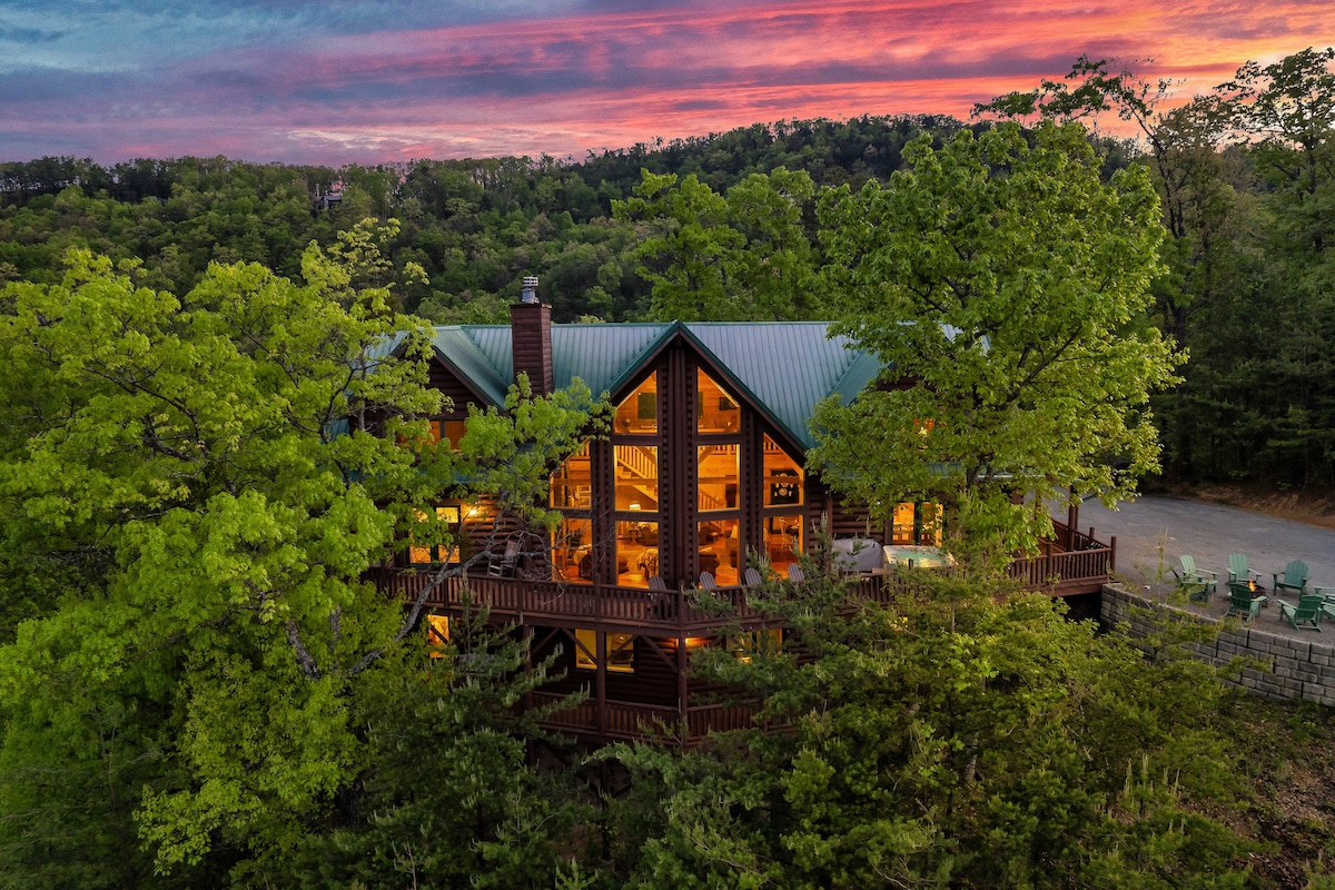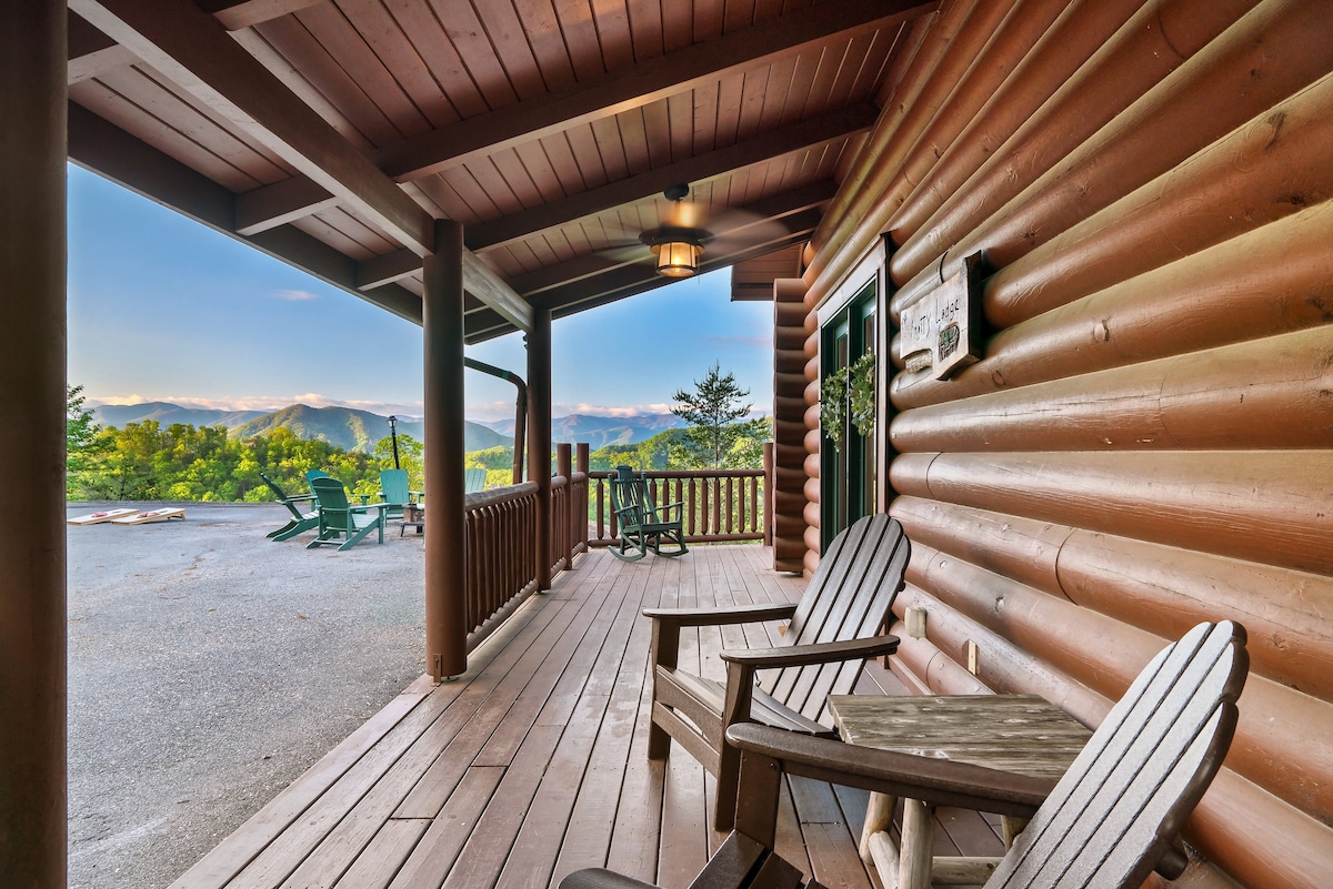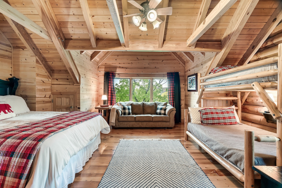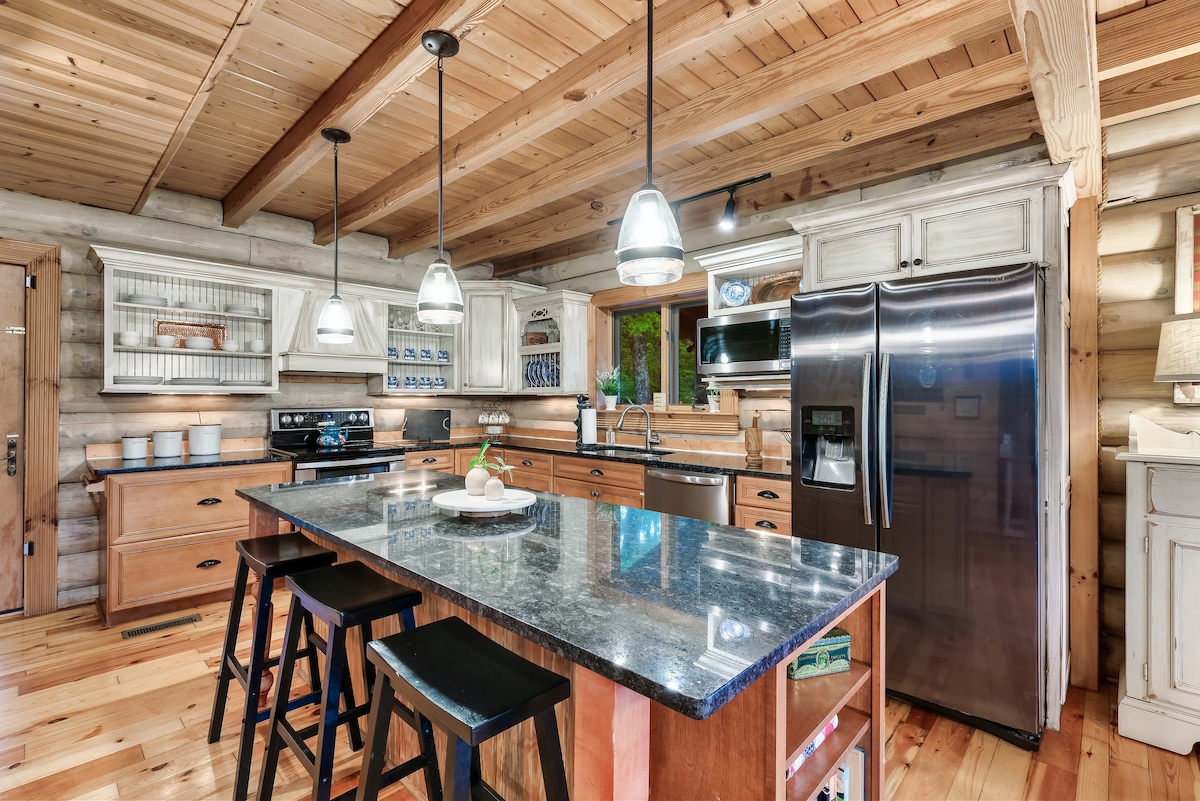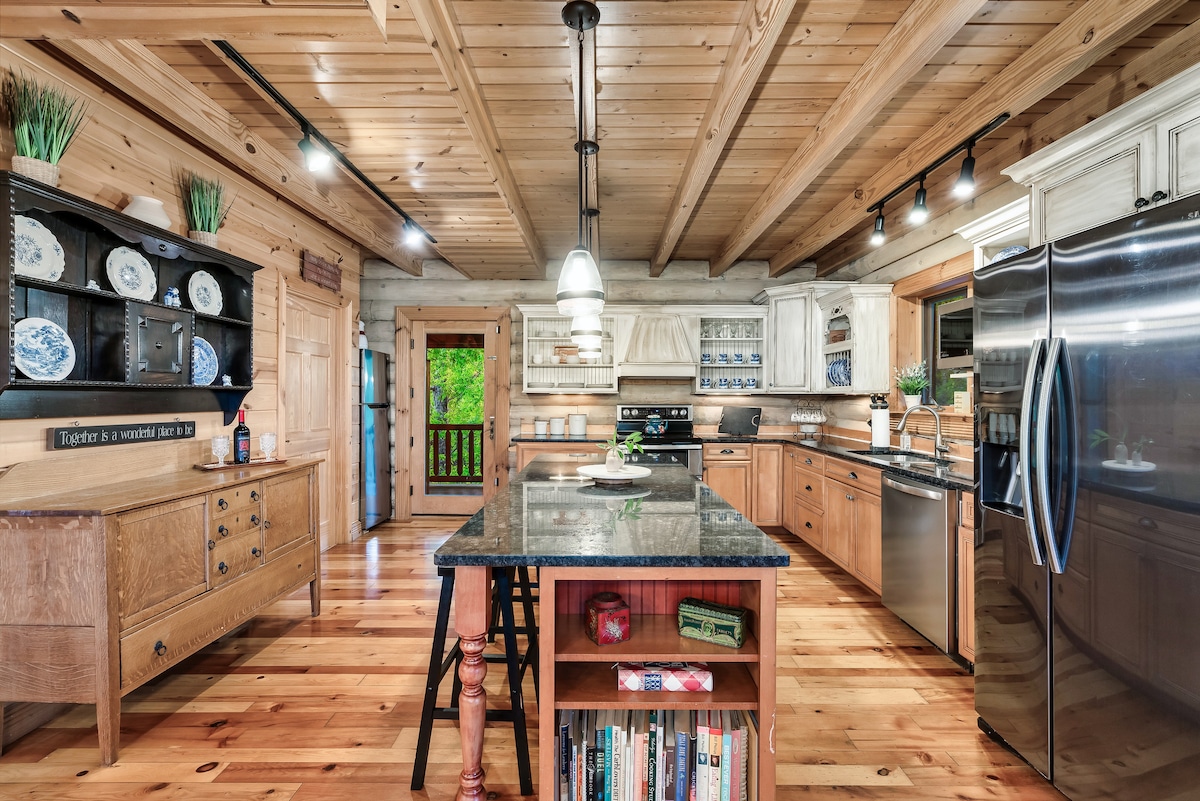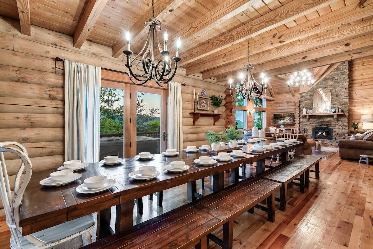 From the handcrafted pine logs to the soaring cathedral ceilings and stone fireplaces, every detail of The Knotty Lodge blends rustic charm with modern luxury. Wake up to panoramic views from 2,100 feet above sea level and enjoy peaceful mornings or relaxing sunsets from the spacious decks.