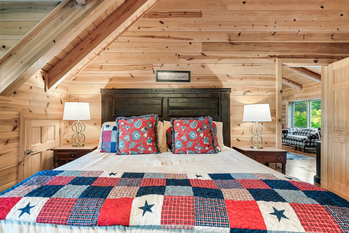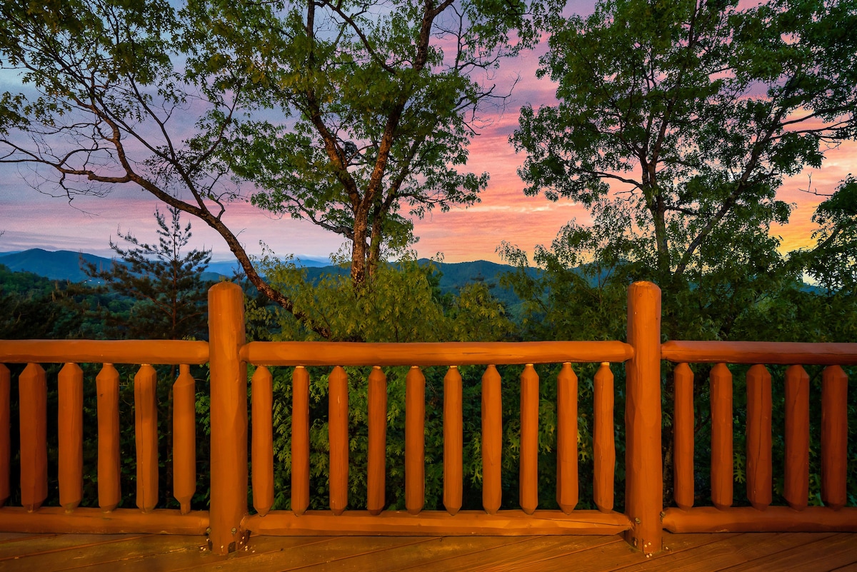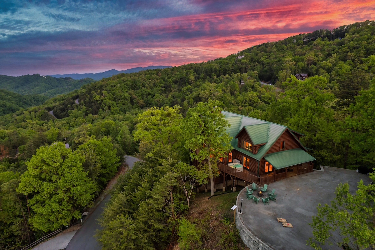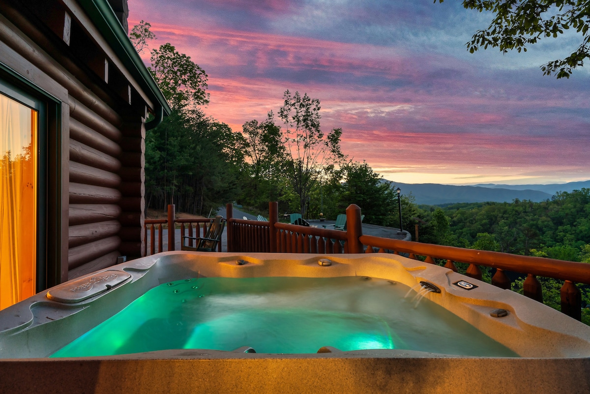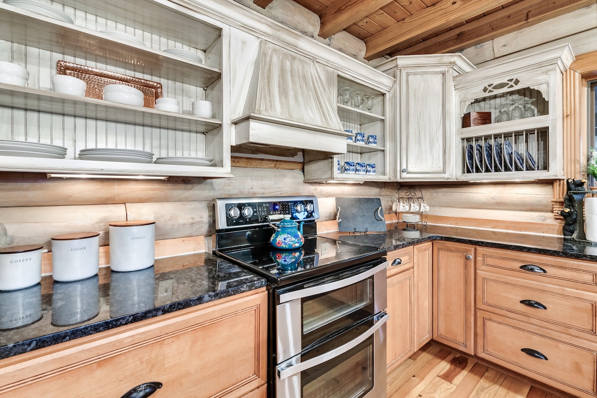 From the handcrafted pine logs to the soaring cathedral ceilings and stone fireplaces, every detail of The Knotty Lodge blends rustic charm with modern luxury. Wake up to panoramic views from 2,100 feet above sea level and enjoy peaceful mornings or relaxing sunsets from the spacious decks.