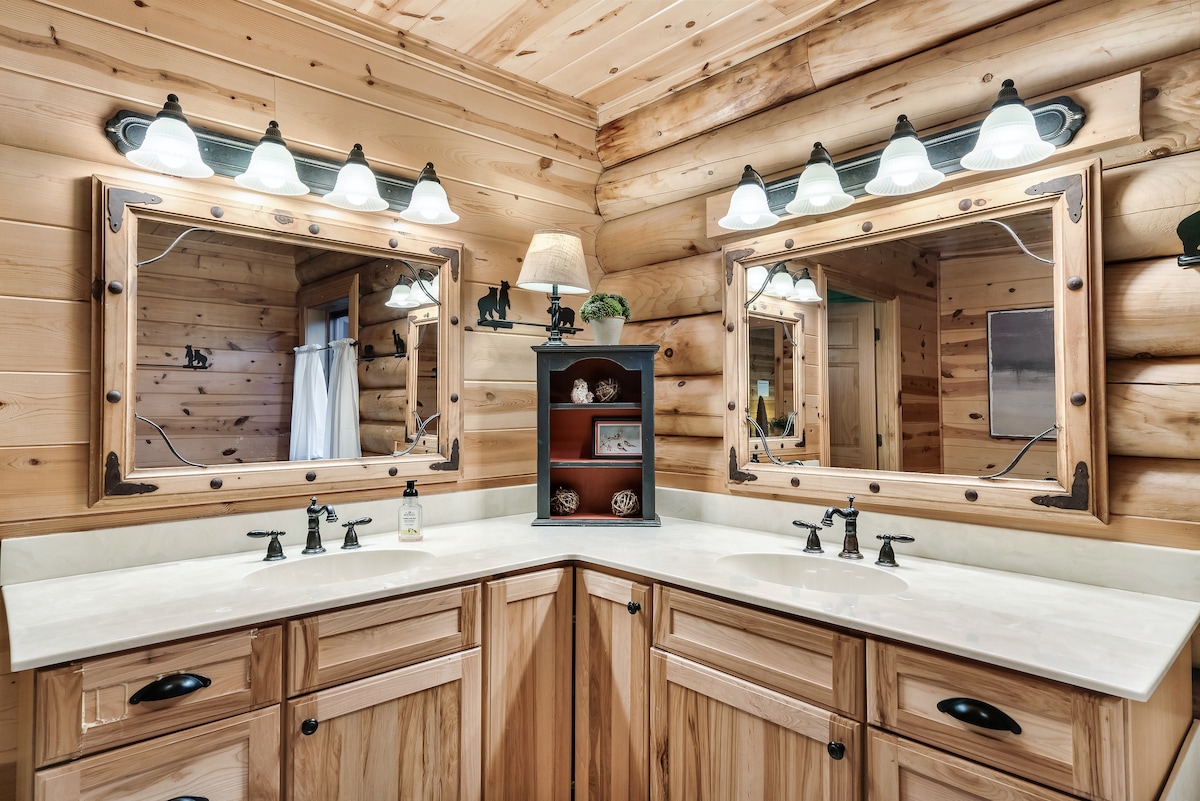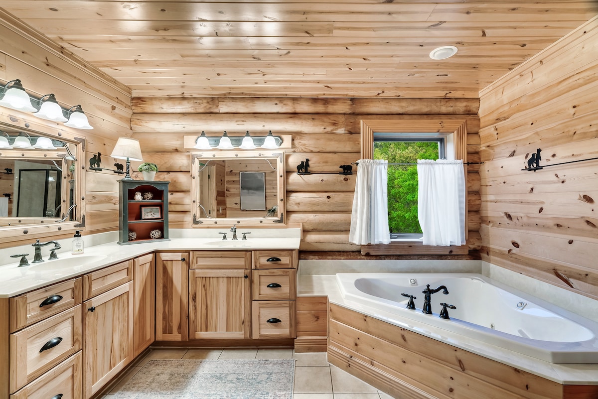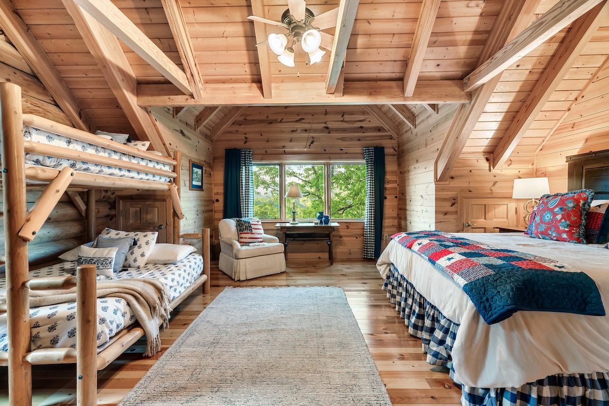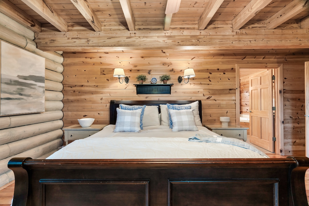 The cabin sleeps 32+ comfortably with 7 king bedrooms, 5 full beds, 6 twin beds, and a sofa sleepers. Each space is outfitted with high-quality mattresses, luxury linens, and room-darkening curtains. The master suite features a private wood-burning fireplace, whirlpool tub, double vanity, and private deck access. Each bedroom is designed for both comfort and privacy.