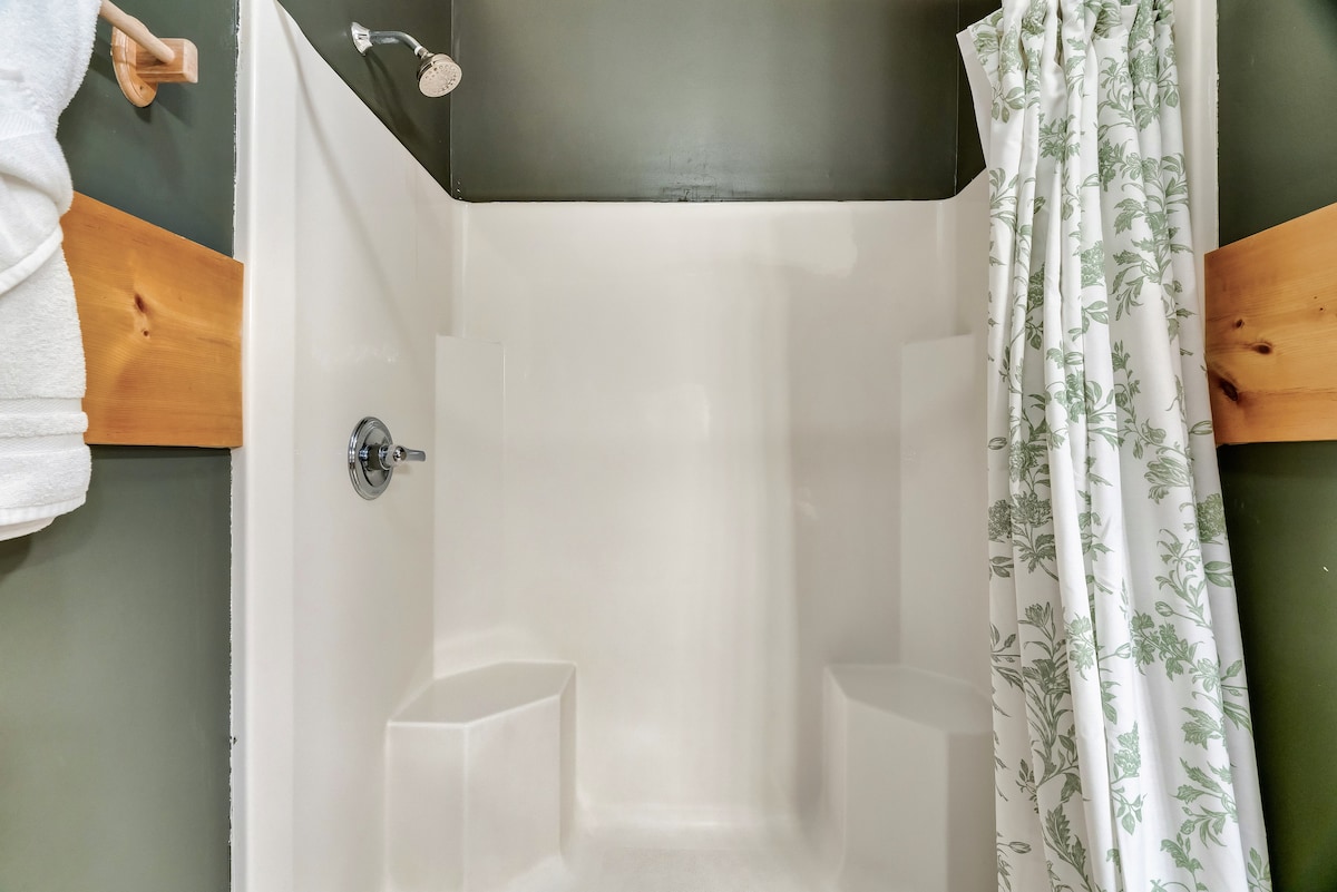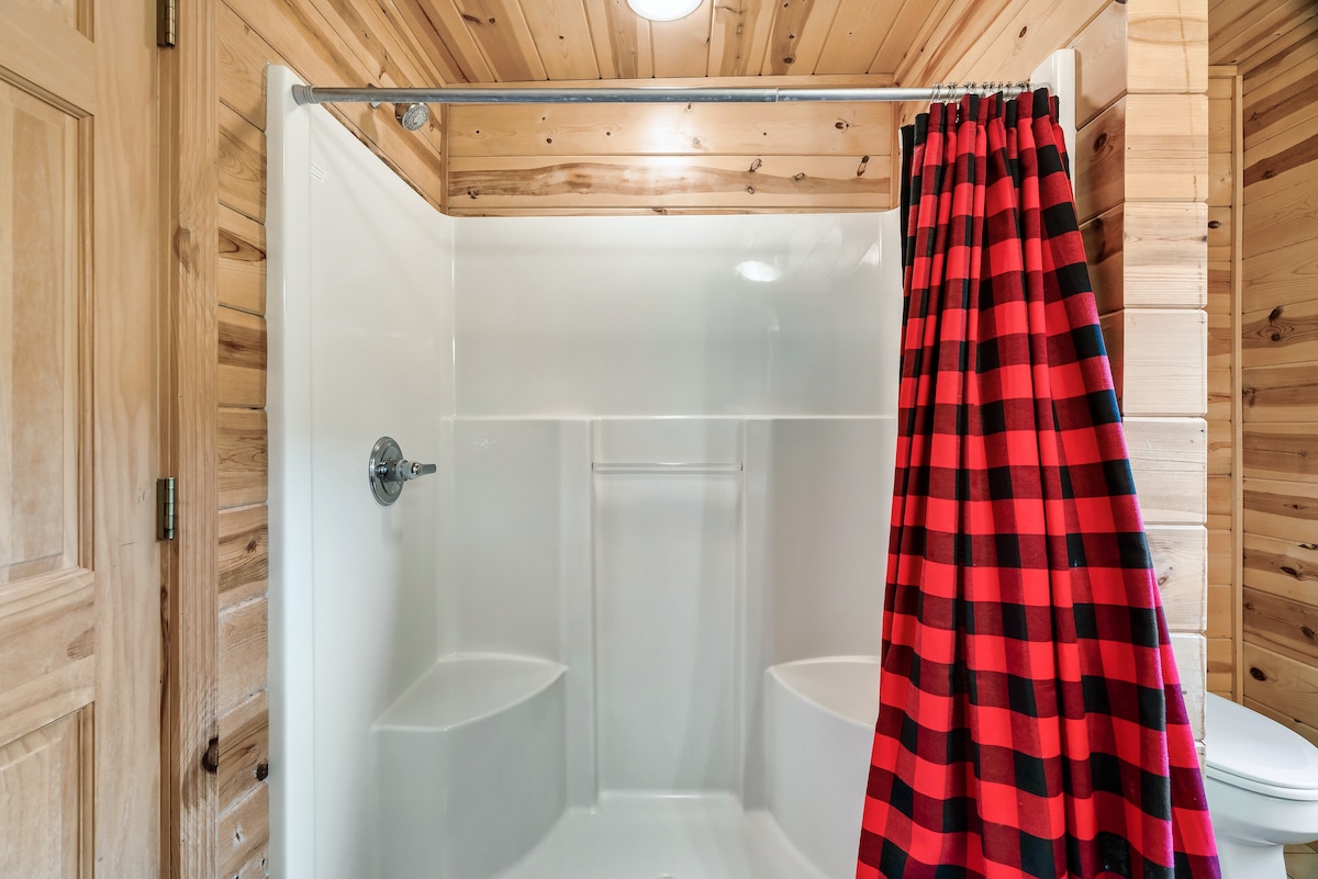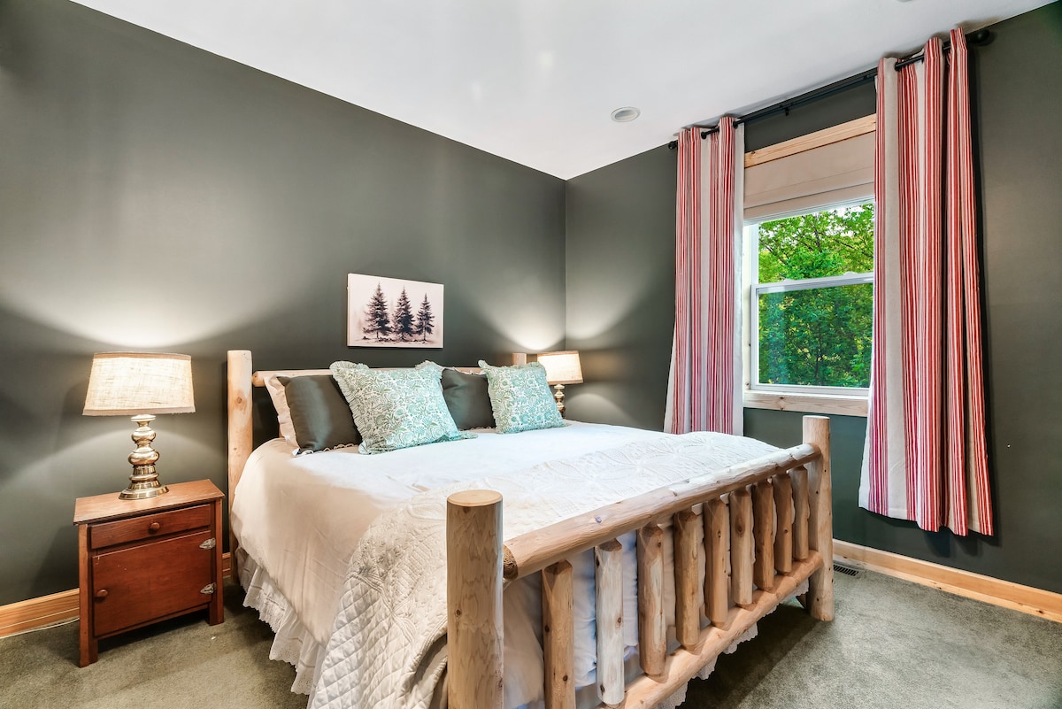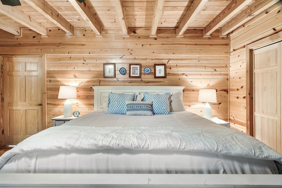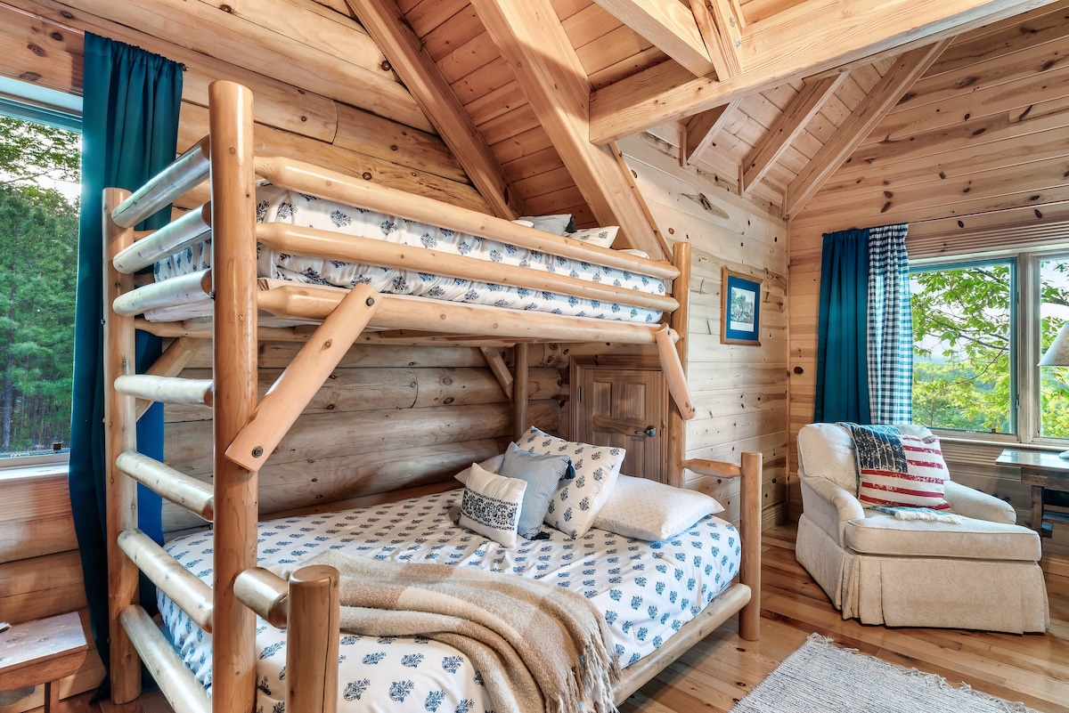 The cabin sleeps 32+ comfortably with 7 king bedrooms, 5 full beds, 6 twin beds, and a sofa sleepers. Each space is outfitted with high-quality mattresses, luxury linens, and room-darkening curtains. The master suite features a private wood-burning fireplace, whirlpool tub, double vanity, and private deck access. Each bedroom is designed for both comfort and privacy.