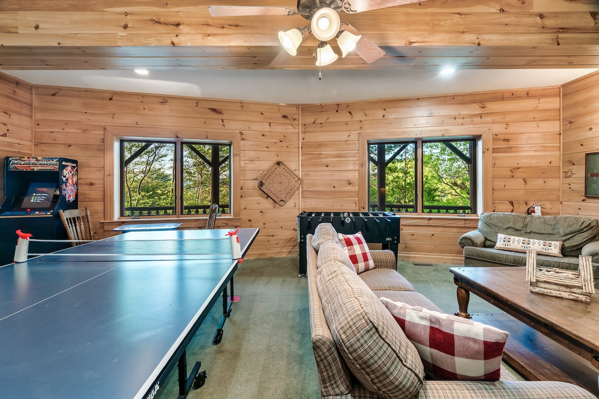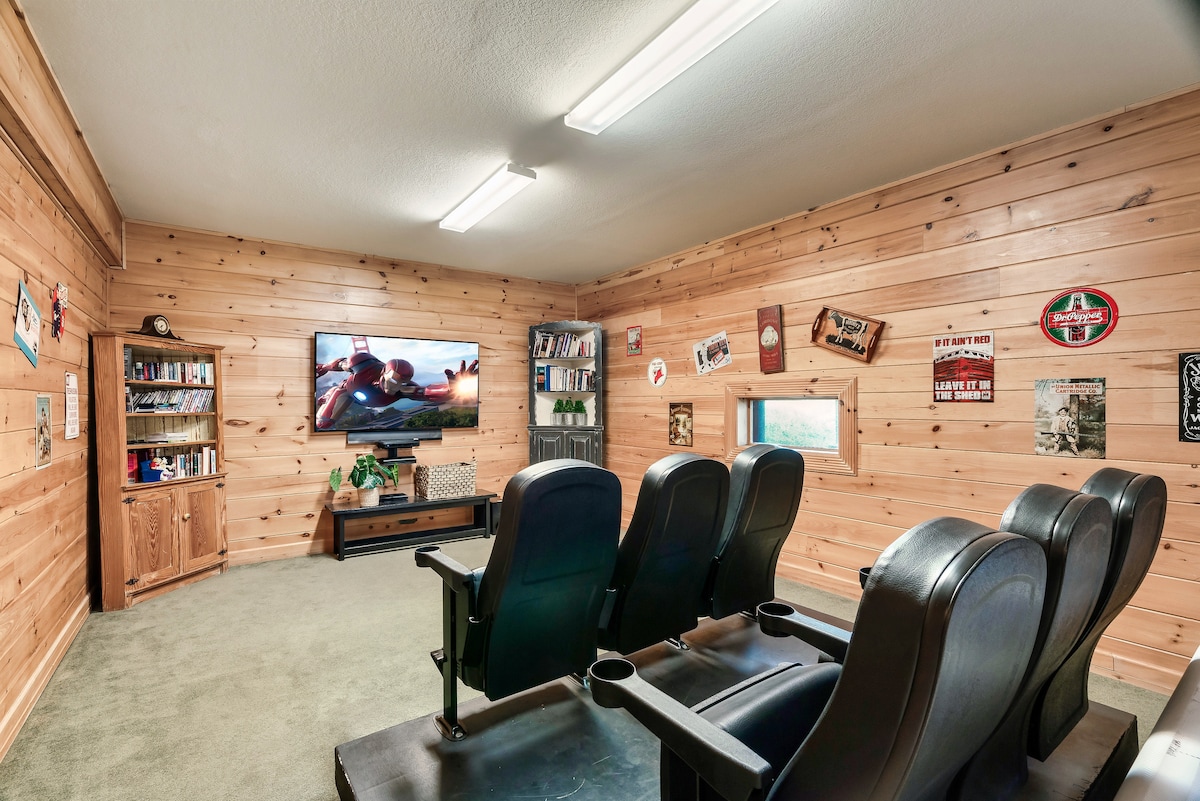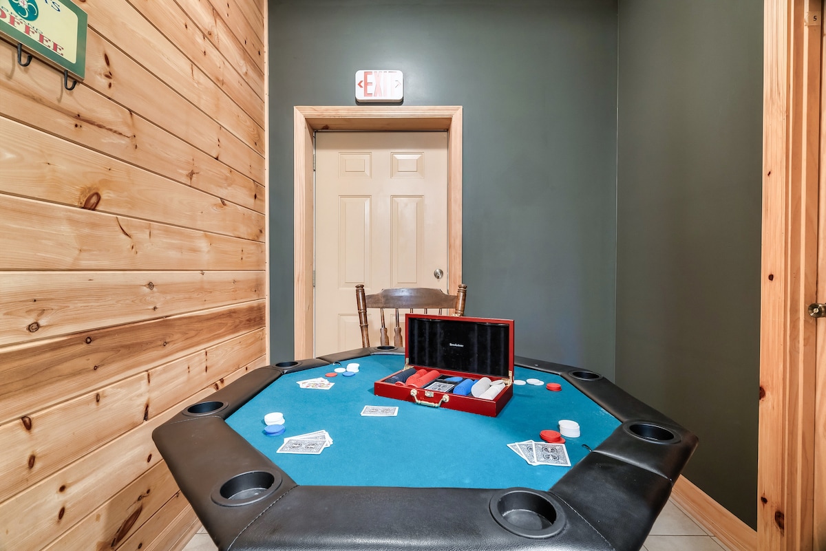 Inside, you'll find a theater room with stadium-style recliner seating, a game room with a pool table, poker table, foosball, air hockey, and ping pong, as well as two-person and classic stand-up arcade games. There are also dry and wet bars, three living areas with wood-burning fireplaces, and high-speed Wi-Fi with streaming-ready TVs.