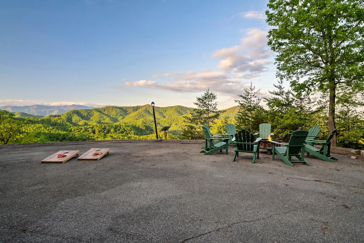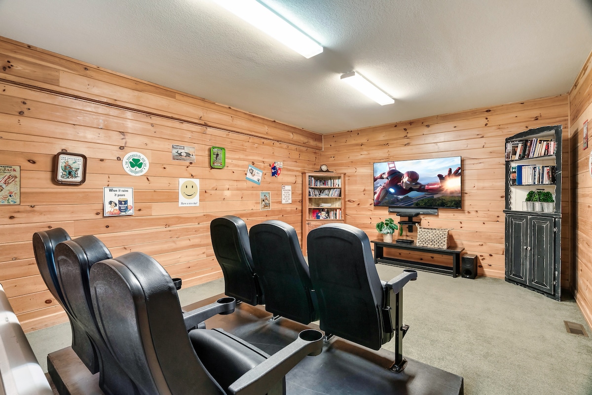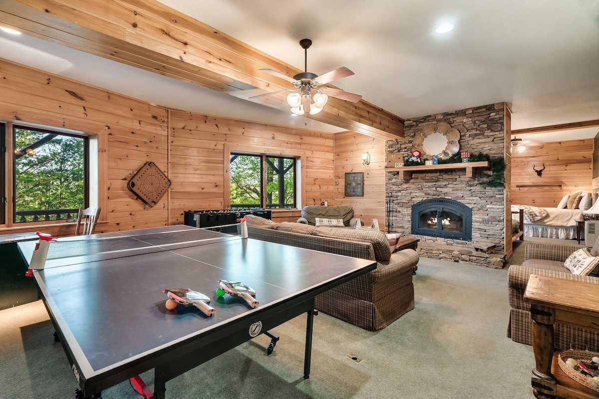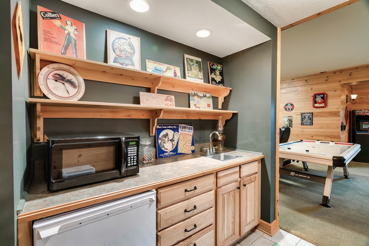 Inside, you'll find a theater room with stadium-style recliner seating, a game room with a pool table, poker table, foosball, air hockey, and ping pong, as well as two-person and classic stand-up arcade games. There are also dry and wet bars, three living areas with wood-burning fireplaces, and high-speed Wi-Fi with streaming-ready TVs.